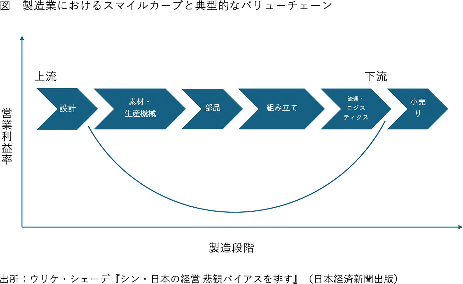 こうして、メイド・イン・ジャパン型のビジネスモデルの強みは終焉を迎えます。これは「スマイルカーブ」で説明できます。スマイルカーブとは、製品のバリューチェーンの各段階で、利益率が異なることを示した仮説です。グラフにすると、中央の製造工程の利益率が最も低く、上流(開発・設計)と下流(物流・販売)の利益率が高くなるので、グラフは口角が上がったかのような、文字どおり“スマイル”の形状になります(図)。中国などの新興国が台頭したことで、日本が得意としてきた組み立て工程の利益率が大幅に低下したのです。