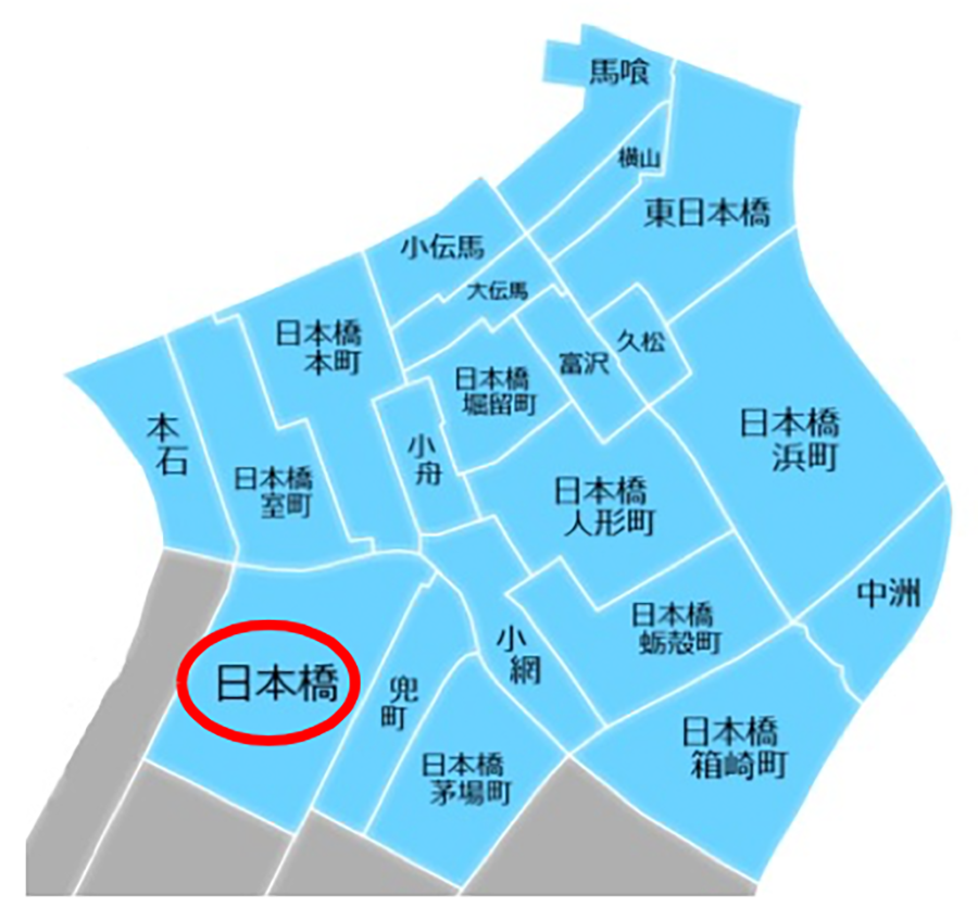 本稿で八重洲・日本橋・京橋として対象とする日本橋は狭義の日本橋で、日本橋川の南側の日本橋一丁目、日本橋二丁目、日本橋三丁目である。