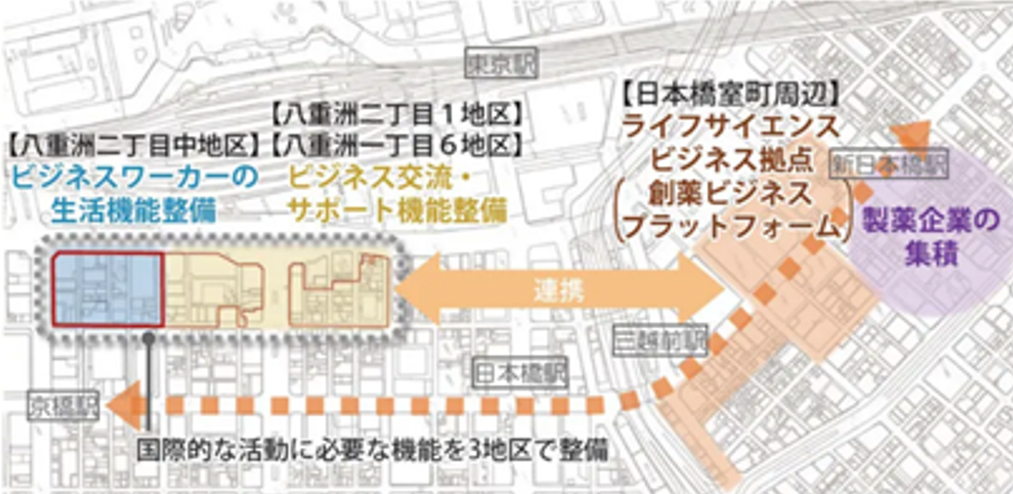 また日本橋川北側のエリアとの機能連携が図られている。例えば、八重洲の東京駅前3地区の開発は、役割分担と機能連携により国際的な活動に必要な都市機能の整備を目指しているが、日本橋川を越えた日本橋室町エリアで進められているライフサイエンス拠点との連携も目指している。また、八重洲一丁目北地区の「呉服橋プロジェクト」が完成すれば、日本最多の10駅がつながる広域地下歩行者ネットワークができる。しかも、ここにはいずれ開通がなされる臨海新地下鉄の新駅も設置予定である。