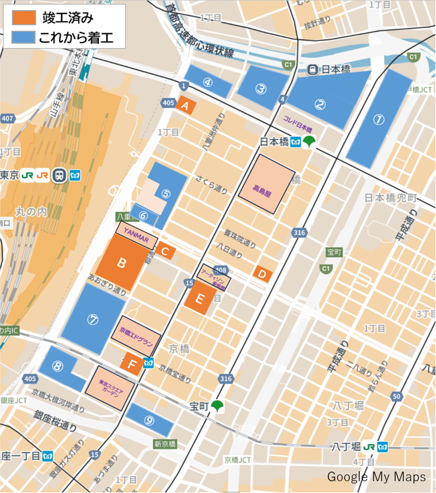 これから、東京駅八重洲駅前に建設される3棟の超高層のうちの2つ目にあたるTOFROM(トフロム) YAESU」が2026年2月に竣工予定であるが、東京駅に地下で直結し、オフィス、医療施設、劇場・カンファレンス施設、バスターミナル、商業施設、住宅などが整備される。また、日本橋川南側沿いの連続した開発のうち、同年3月にMICE施設、ビジネス支援施設、ホテルを含む「日本橋一丁目中地区」も竣工予定となっている。2028年には、エリア外であるが、東京駅日本橋口の北東の街区で日本一の高さとなる「TOKYO TORCH TOWER」の竣工が予定されている。