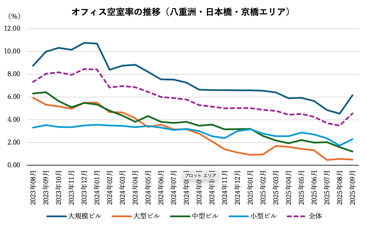 空室率でいえば、最も空室率が低いのは床面積が100~200坪の大型ビルであるのに対して、大規模ビルは供給量も多いこともあり空室率は高めになりやすい。コロナ禍の影響がまだあった2023年末には10%を超えていたこともある。しかし、都心の他のエリアと同じように、2024年に入ると状況は大幅に好転して、2025年9月には6.15%にまで下がった。大型ビルでは0.51%まで下がり、空きはないところまできた。中型ビルと小型ビルも1.20と2.30で、2%前後で推移しており需給がひっ迫する状況になっている。
