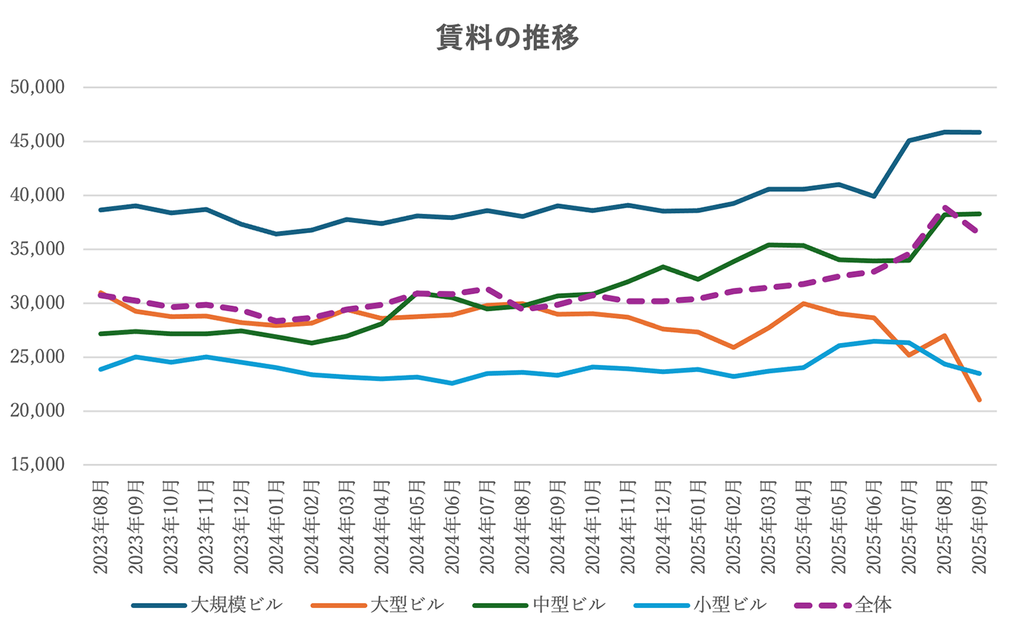 これに対して、安定的に2万5千円前後を推移してきた小型ビルが2025年7月の26,333円から9月の23,486円へと3千円弱の下落をしたが、それまでの2年間の振れからみれば、その幅に入っていると判断できる。ところが空室率のもっとも低い大型ビルでは、6月から9月の3カ月間に28,625円から21,000円と大きな下落をし、それまでの賃料3万円前後という推移と異なり、2万円近くになり小型ビルを下回ることになった。需要の高いクラスでの賃料下落という需給関係だけでは説明できないことが起きているので、その後の推移を見守る必要がある。