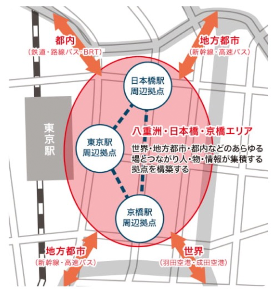 八重洲・日本橋・京橋エリアは丸の内側に比べてオフィス街の整備や新たな再開発が遅れていたが、東京駅を中心とした全国鉄道網のハブ機能、長距離バス網のターミナル、地下鉄網、高速道路網など、他のエリアと比べて圧倒的な量の交通基盤が整備し続けられてきたことで、未来に向けたポテンシャルが高まっている。今後も、2031年度を目指した羽田アクセス線、2040年までの開通を目指す臨海新地下鉄線の整備などによって、羽田国際空港へのアクセス向上が期待されている。